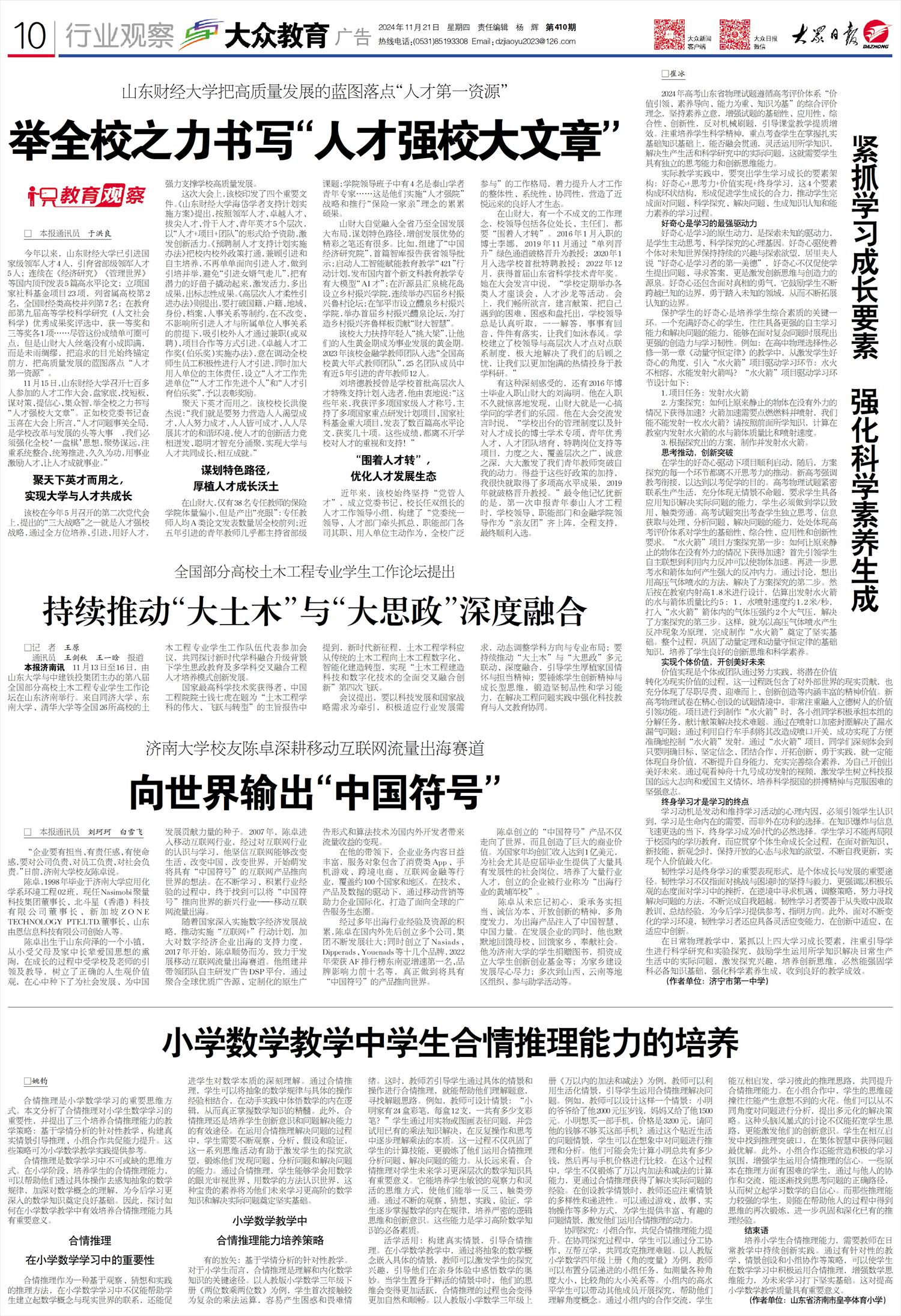 会议提出,要以科技发展和国家战略需求为牵引,积极适应行业发展需求,动态调整学科方向与专业布局;要持续推动“大土木”与“大思政”多元联动、深度融合,引导学生厚植家国情怀与担当精神;要锤炼学生创新精神与成长型思维,锻造坚韧品性和学习能力,在解决工程问题实践中强化科技教育与人文教育协同。