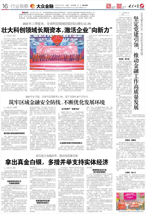 近年来,山东加力筑牢区域金融安全防线,不断优化发展环境,大力实施地方金融监管一体化工程,在全国率先开展地方金融组织风险评价监测,推动地方金融组织减量提质;聚焦地方中小金融机构、重点企业和非法集资等领域金融风险,强化监测预警、分析研判和应对处置机制建设,牢牢守住不发生系统性风险底线。2024年11月底,全省不良贷款率1.3%,低于全国0.29个百分点。