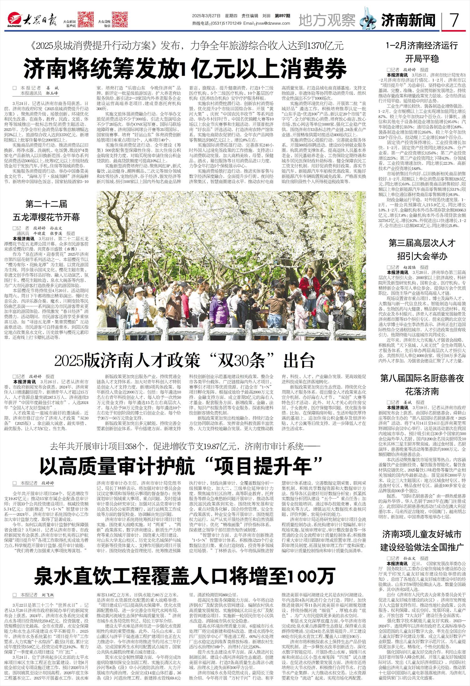 3月24日,记者从济南市商务局获悉,日前,济南市政府印发《2025泉城消费提升行动方案》,聚焦消费升级、场景创新、环境优化和民生改善,在商务、教育、民政、文旅、体育等领域推出一批标志性促消费主题活动。2025年,力争全市社会消费品零售总额增幅达到3%以上,旅游综合收入达到1370亿元,新增限额以上批零住餐单位2000家以上。