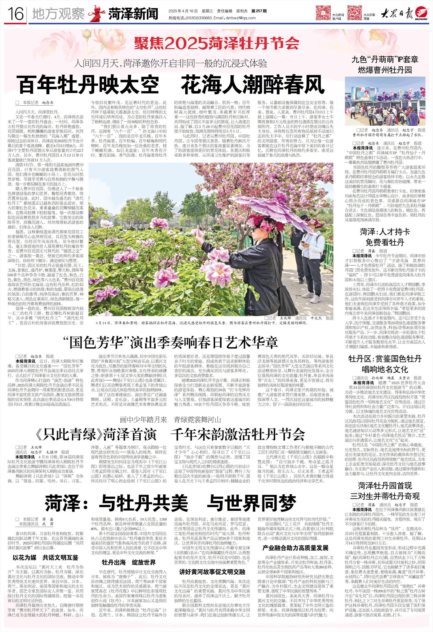 4月14日,菏泽春和景明。游客徜徉在牡丹花海,沉浸式感受牡丹的国色天香。图为游客在曹州牡丹园打卡,定格美丽的瞬间。