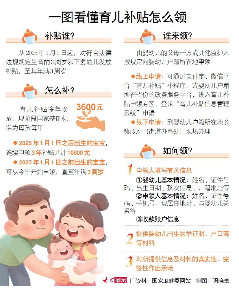 此前,中共中央办公厅、国务院办公厅印发《育儿补贴制度实施方案》,明确2025年1月1日之前出生、不满3周岁的婴幼儿均可领取补贴。现阶段国家基础标准为每年3600元。今年1月1日之后出生的宝宝,连续申请3年补贴共计10800;2025年1月1日之前出生的宝宝,可以从今年开始申领,直至年满3周岁。