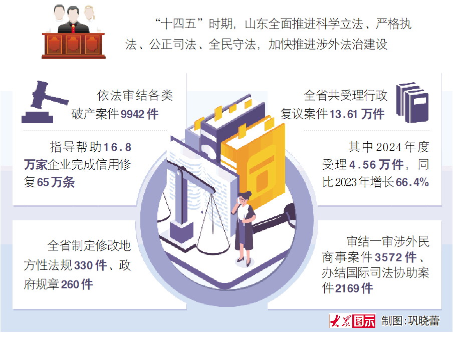 本报济南10月9日讯 记者今天从省政府新闻办举行的新闻发布会上获悉,“十四五”时期,山东全面推进科学立法、严格执法、公正司法、全民守法,加快推进涉外法治建设,为新时代社会主义现代化强省建设提供了有力法治保障。山东连续四年入选营商环境最好10个省份,其中法治环境位居全国前列。
