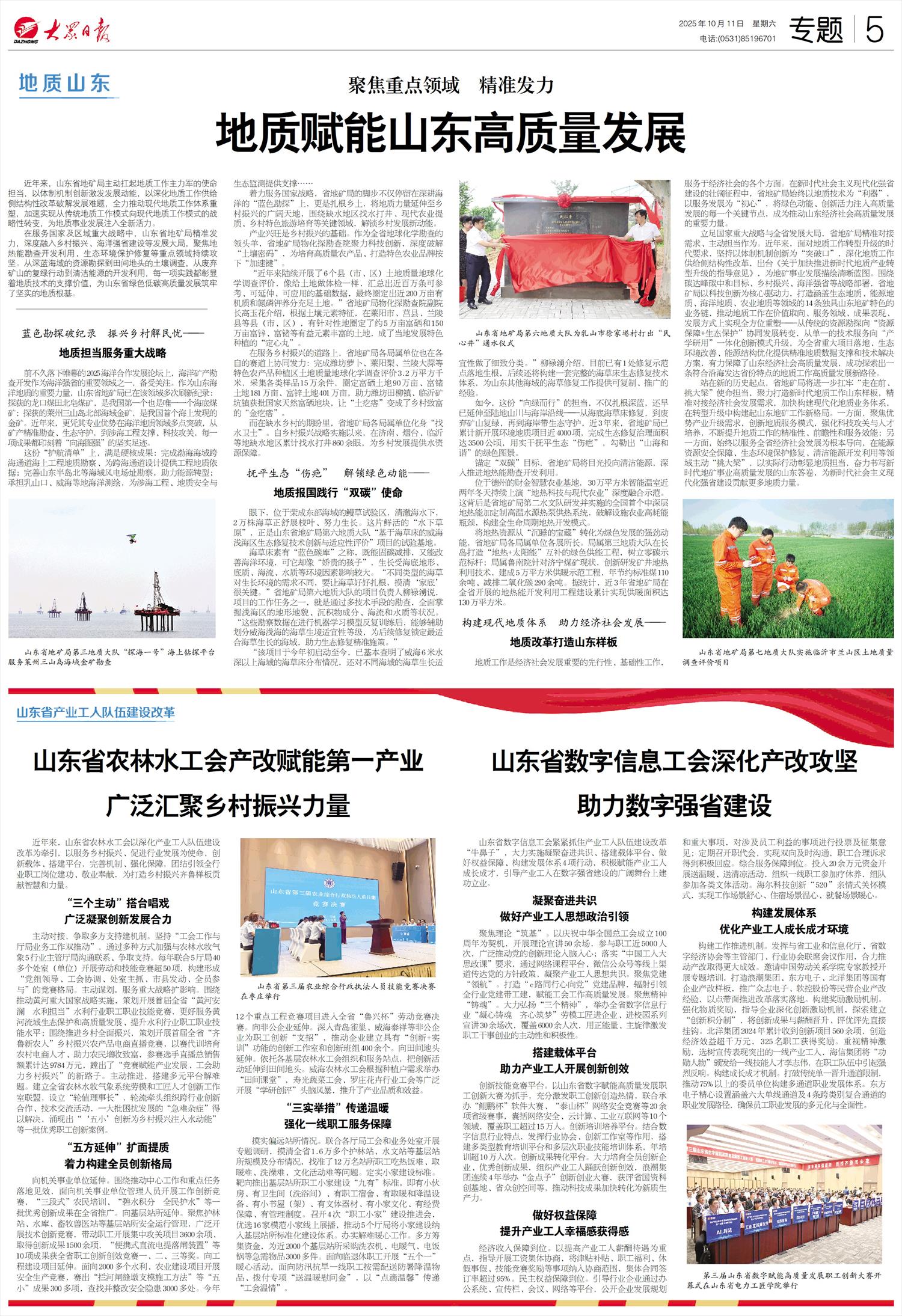 地质担当服务重大战略 前不久落下帷幕的2025海洋合作发展论坛上,海洋矿产勘查开发作为海洋强省的重要领域之一,备受关注。作为山东海洋地质的重要力量,山东省地矿局已在该领域多次刷新纪录:探获的龙口煤田北皂煤矿,是我国第一个也是唯一一个海底煤矿;探获的莱州三山岛北部海域金矿,是我国首个海上发现的金矿。近年来,更凭其专业优势在海洋地质领域多点突破,从矿产精准勘查、生态守护,到涉海工程支撑、科技攻关,每一项成果都印刻着“向海图强”的坚实足迹。