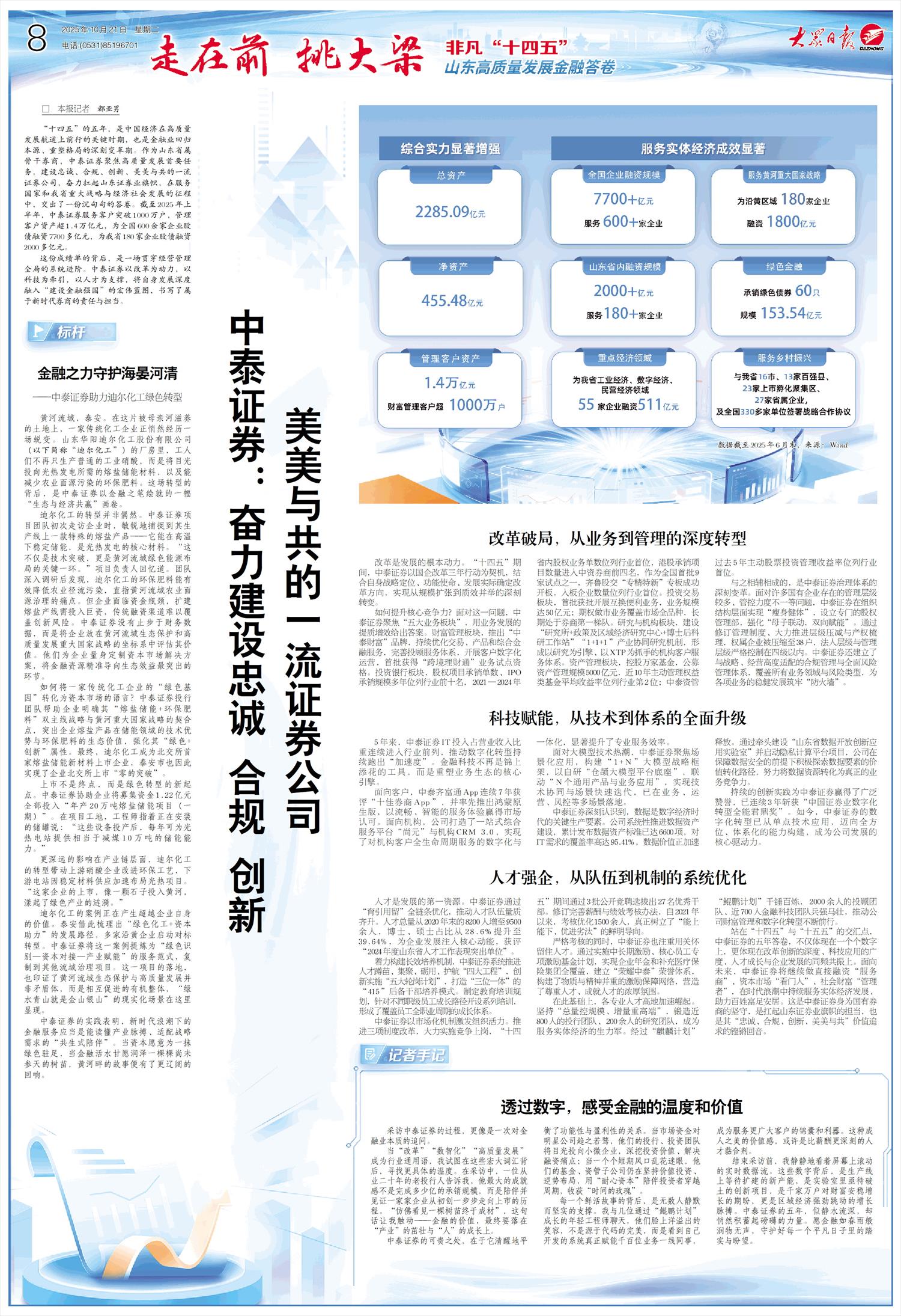 “十四五”的五年,是中国经济在高质量发展航道上前行的关键时期,也是金融业回归本源、重塑格局的深刻变革期。作为山东省属骨干券商,中泰证券聚焦高质量发展首要任务,建设忠诚、合规、创新、美美与共的一流证券公司,奋力扛起山东证券业旗帜,在服务国家和我省重大战略与经济社会发展的征程中,交出了一份沉甸甸的答卷。截至2025年上半年,中泰证券服务客户突破1000万户,管理客户资产超1.4万亿元,为全国600余家企业股债融资7700多亿元,为我省180家企业股债融资2000多亿元。
