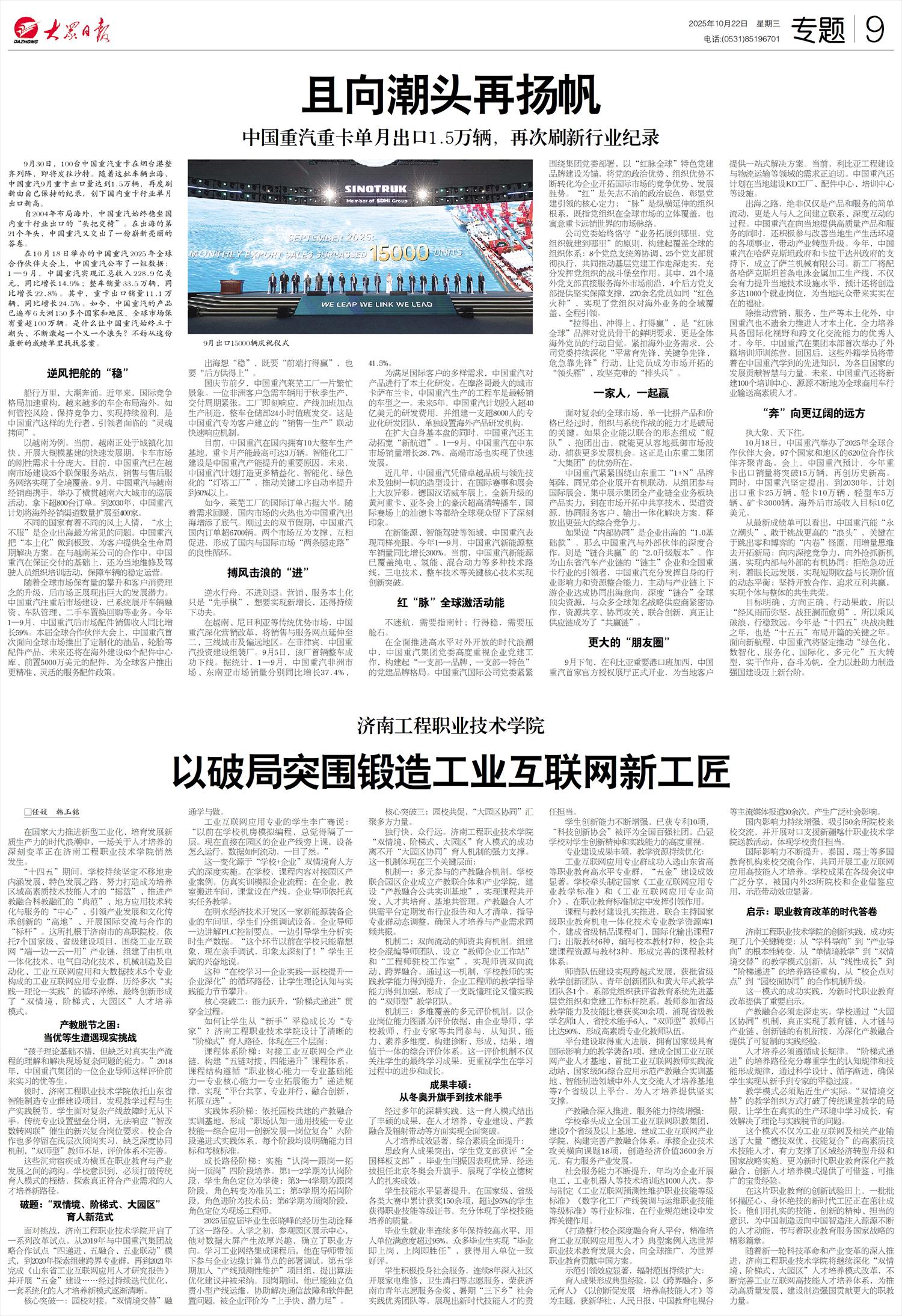 在10月18日举办的中国重汽2025年全球合作伙伴大会上,中国重汽公布了一组数据:1—9月,中国重汽实现汇总收入228.9亿美元,同比增长14.9%;整车销量33.5万辆,同比增长22.8%。其中,重卡出口销量11.1万辆,同比增长24.5%。如今,中国重汽的产品已遍布6大洲150多个国家和地区,全球市场保有量超100万辆。是什么让中国重汽始终立于潮头、不断激起一个又一个浪头?不妨从这份最新的成绩单里找找答案。