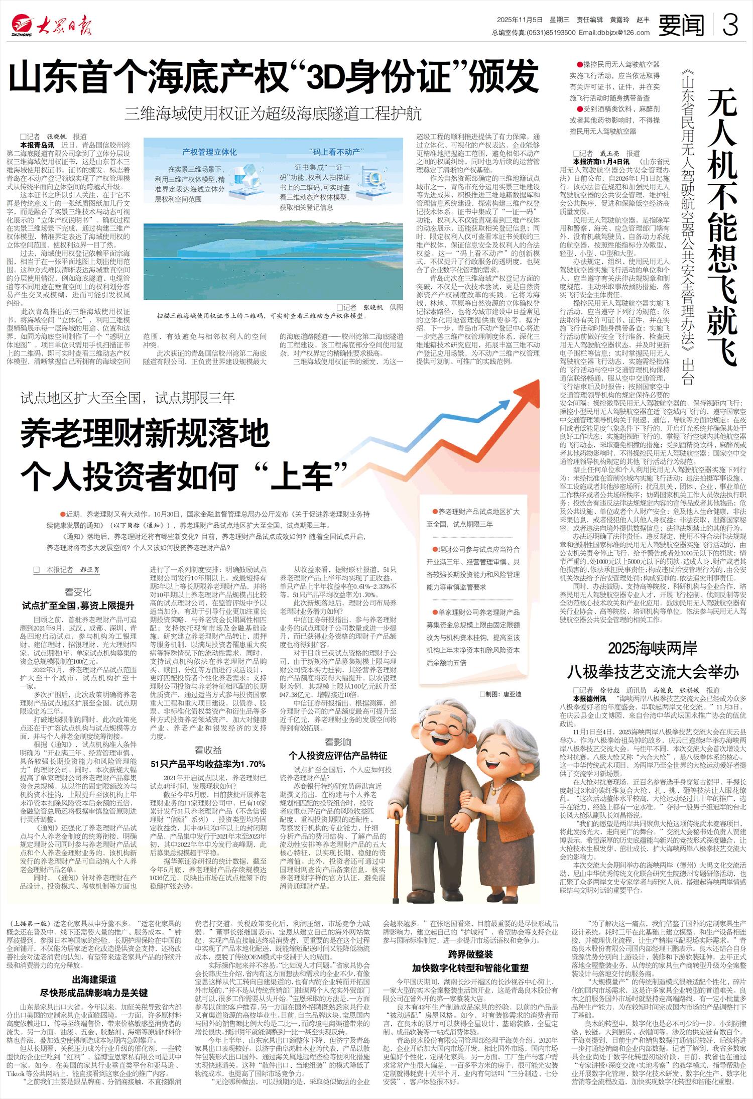 本报济南11月4日讯 《山东省民用无人驾驶航空器公共安全管理办法》日前公布,自2026年1月1日起施行。该办法旨在规范和加强民用无人驾驶航空器的公共安全管理,维护社会公共秩序,促进和保障低空经济高质量发展。