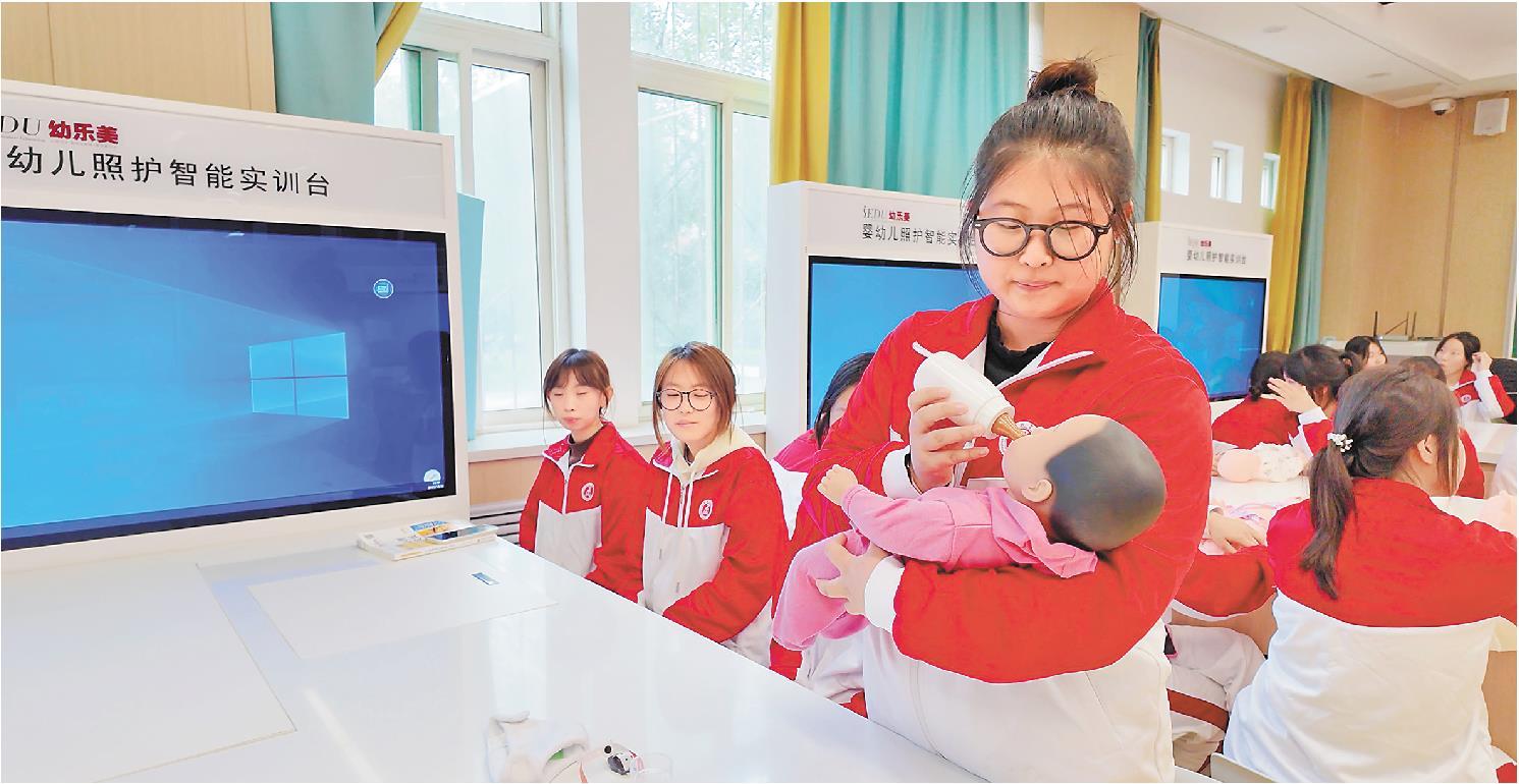 喂奶、拍嗝、哄睡……在齐鲁师范学院婴幼儿发展与健康管理实验室内,学生陈晶通过内置芯片的AI仿真婴儿熟练地进行着一系列照料操作。“我们通过它发出的不同声音判断是饿了要喝奶,还是困了想睡觉,再做出对应的照料动作。”在学习喂奶、洗澡、哄睡等基础照料技能的同时,学生们还需要积累“读懂孩子信号”的能力。