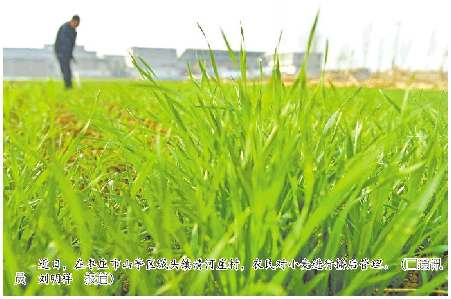 近日,在枣庄市山亭区城头镇清河崖村,农民对小麦进行播后管理。(□通讯员刘明祥报道)