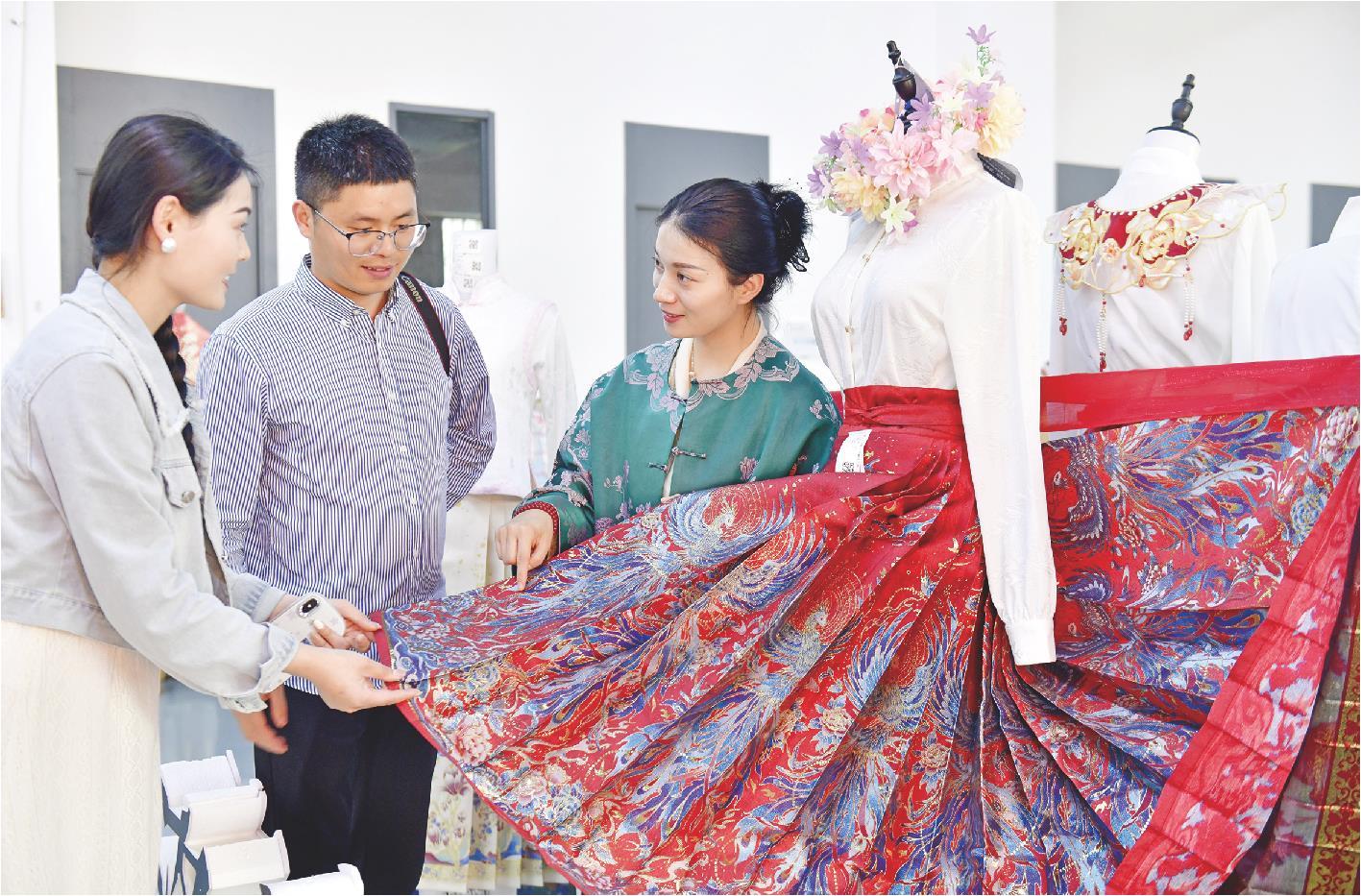 菏泽市曹县有爱云仓汉服基地负责人姚驰行(右)向参观者介绍马面裙。