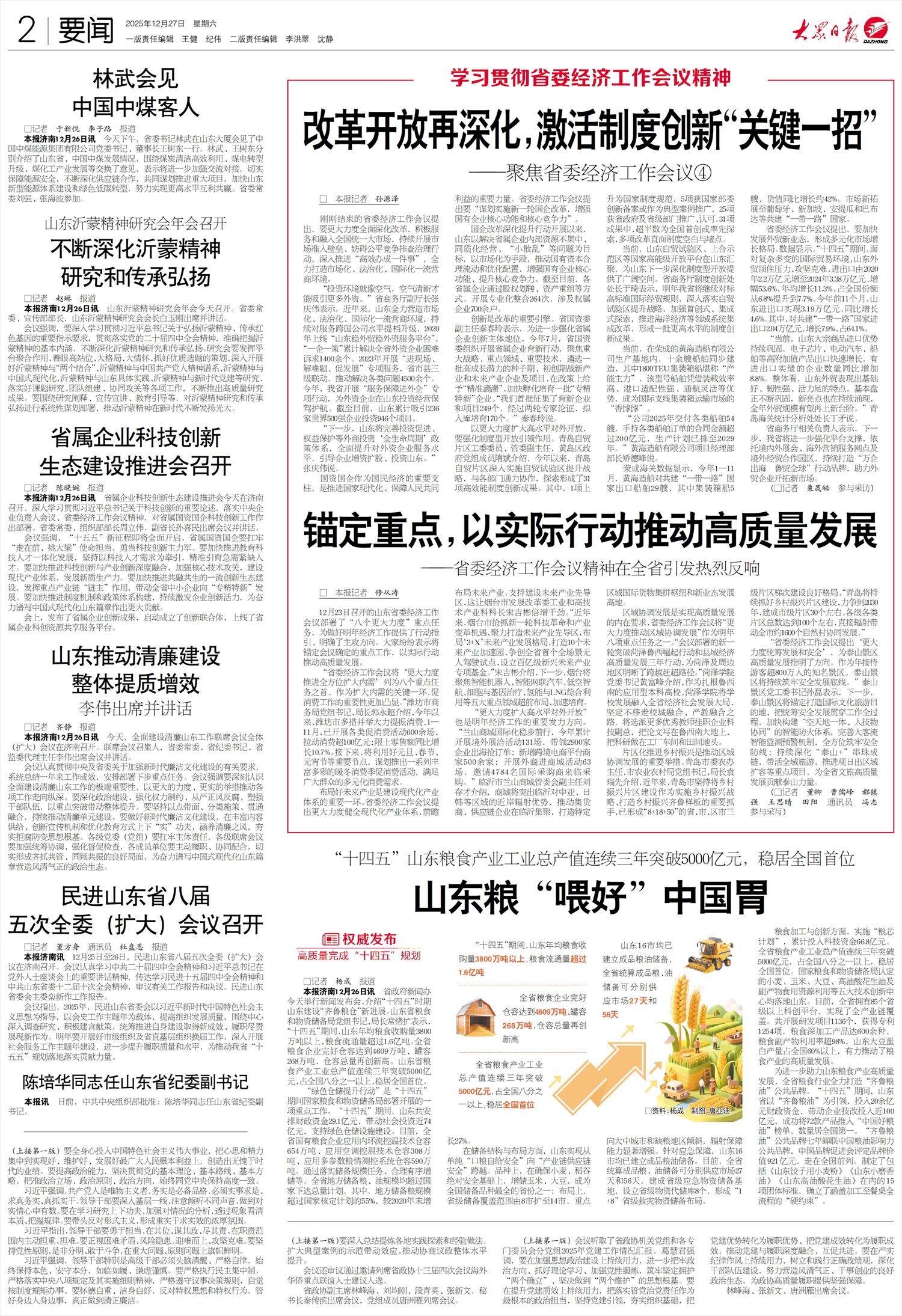 12月23日召开的山东省委经济工作会议部署了“八个更大力度”重点任务,为做好明年经济工作提供了行动指引、明确了主攻方向。大家纷纷表示将锚定会议确定的重点工作,以实际行动推动高质量发展。