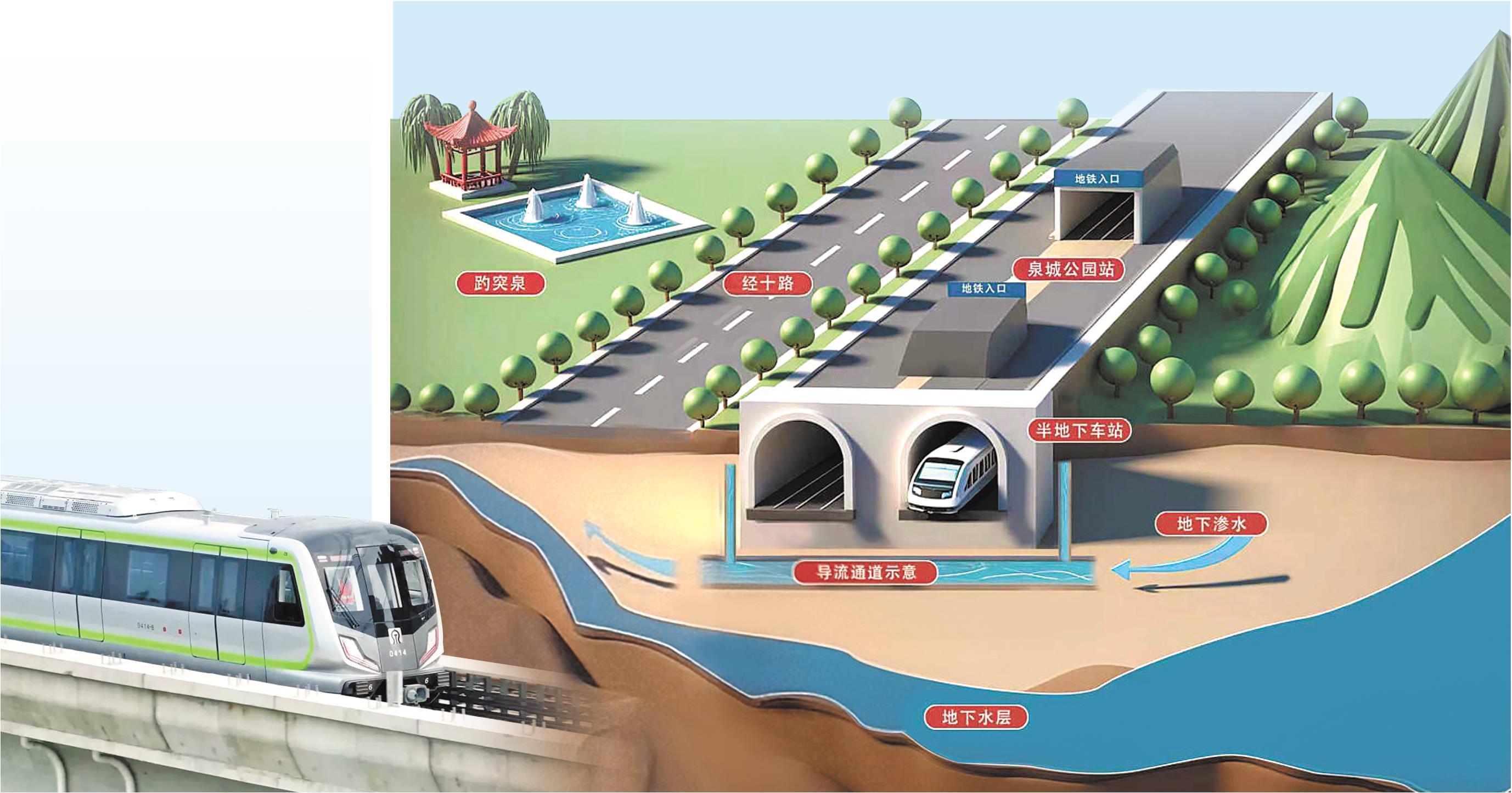 地铁为泉水“龙抬头” 从2021年开始,地铁二期线路陆续开工。“我们错峰施工,临近保泉核心区相邻车站、区间分期实施,敏感站点分块分段开挖,减少基坑大面积降水引起的对周边地下水的影响。”山东轨道交通勘察设计院副总工程师、高级工程师李志强说。