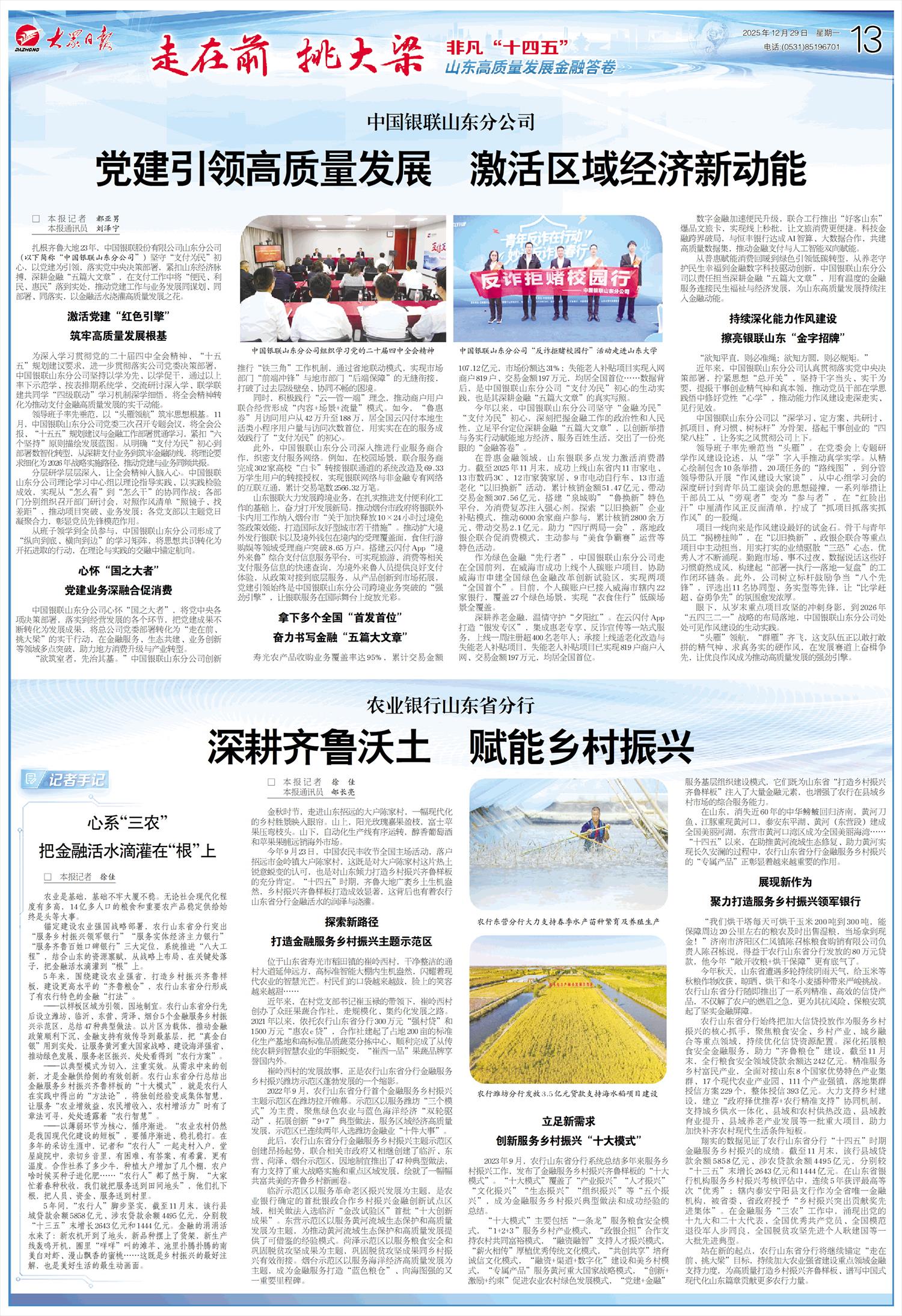 从普惠赋能消费回暖到绿色引领低碳转型,从养老守护民生幸福到金融数字科技驱动创新,中国银联山东分公司以责任担当深耕金融“五篇大文章”,用有温度的金融服务连接民生福祉与经济发展,为山东高质量发展持续注入金融动能。