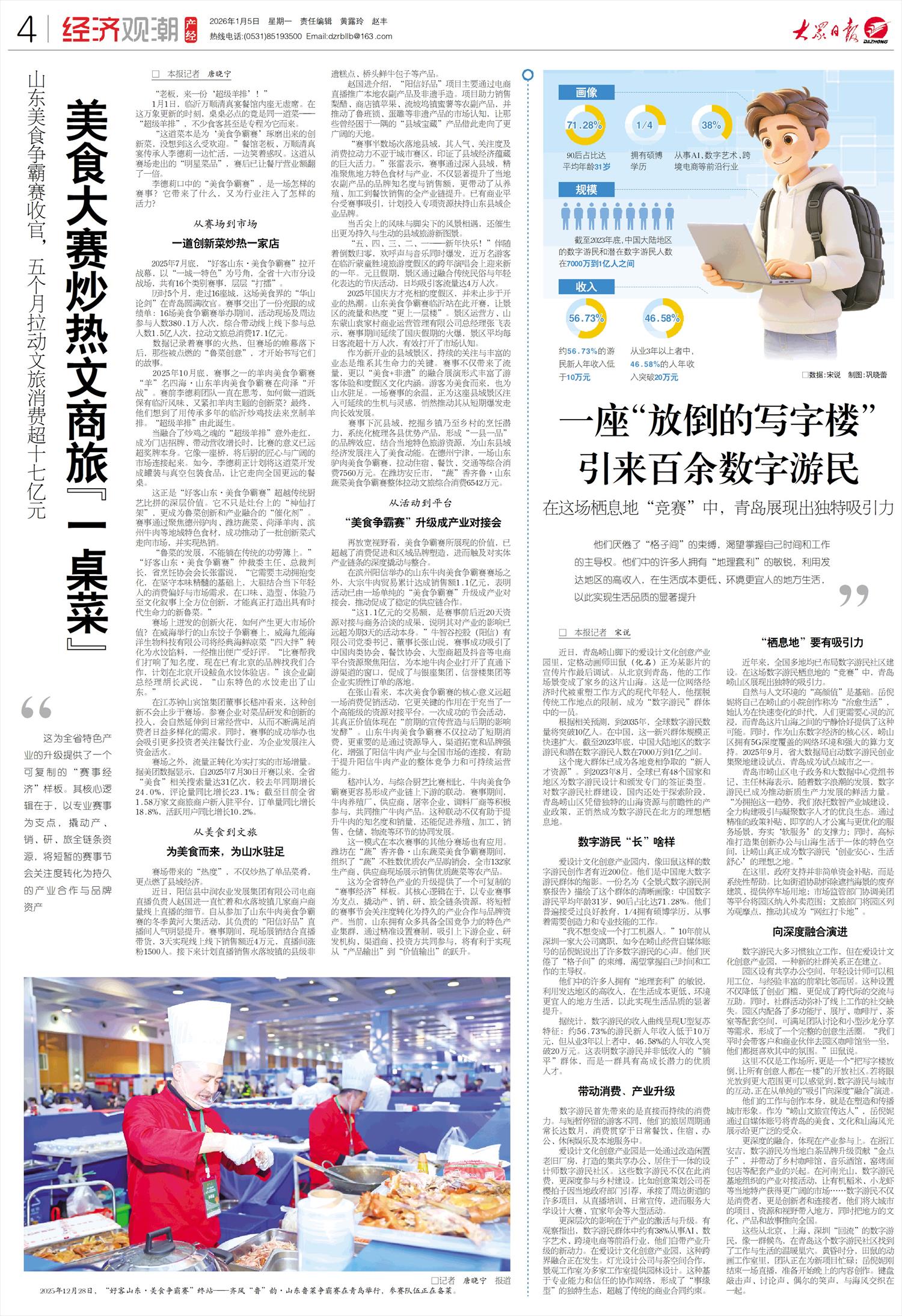 “赛事半数场次落地县域,其人气、关注度及消费拉动力不亚于城市赛区,印证了县域经济蕴藏的巨大活力。”张雷表示,赛事通过深入县域,精准聚焦地方特色食材与产业,不仅显著提升了当地农副产品的品牌知名度与销售额,更带动了从养殖、加工到餐饮销售的全产业链提升。已有商业平台受赛事吸引,计划投入专项资源扶持山东县域企业品牌。