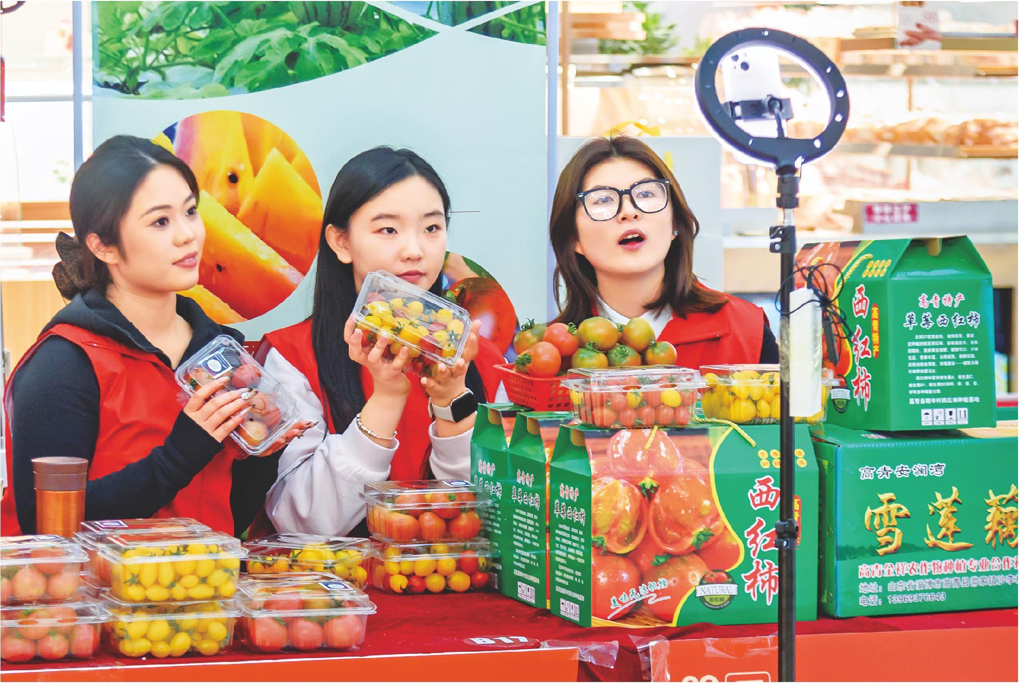 近日,山东轻工职业学院师生在淄博万达广场“山东省2026年巾帼年货大集”现场直播带货,推介当地特产。