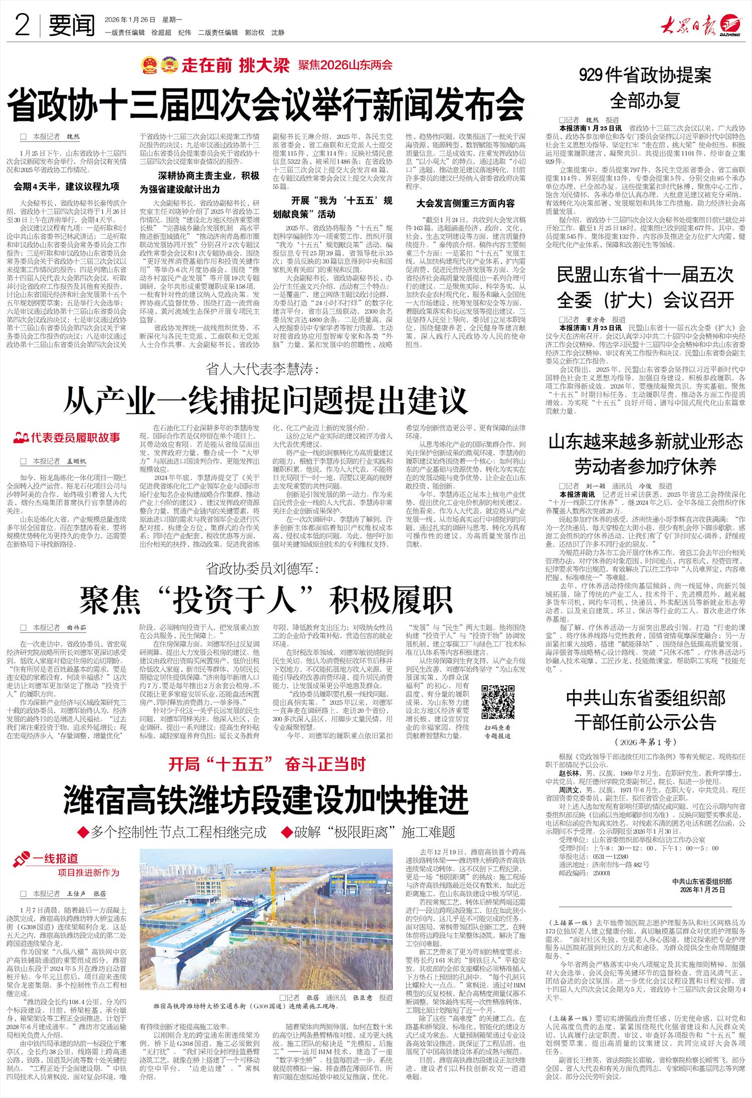 深耕协商主责主业,积极为强省建设献计出力 大会副秘书长,省政协副秘书长、研究室主任刘晓钟介绍了2025年省政协工作情况。围绕“建设北方地区经济重要增长极”“完善城乡融合发展机制 高水平推进新型城镇化”“推动济南青岛都市圈联动发展协同开放”分别召开2次专题议政性常委会会议和1次专题协商会,围绕“更好发挥消费基础作用和投资关键作用”等举办6次月度协商会,围绕“推动乡村富民产业发展”等开展19次专题调研,全年共形成重要履职成果158项,一批有针对性的建议纳入党政决策。发挥协商式监督优势,围绕打造一流营商环境、黄河流域生态保护开展专项民主监督。