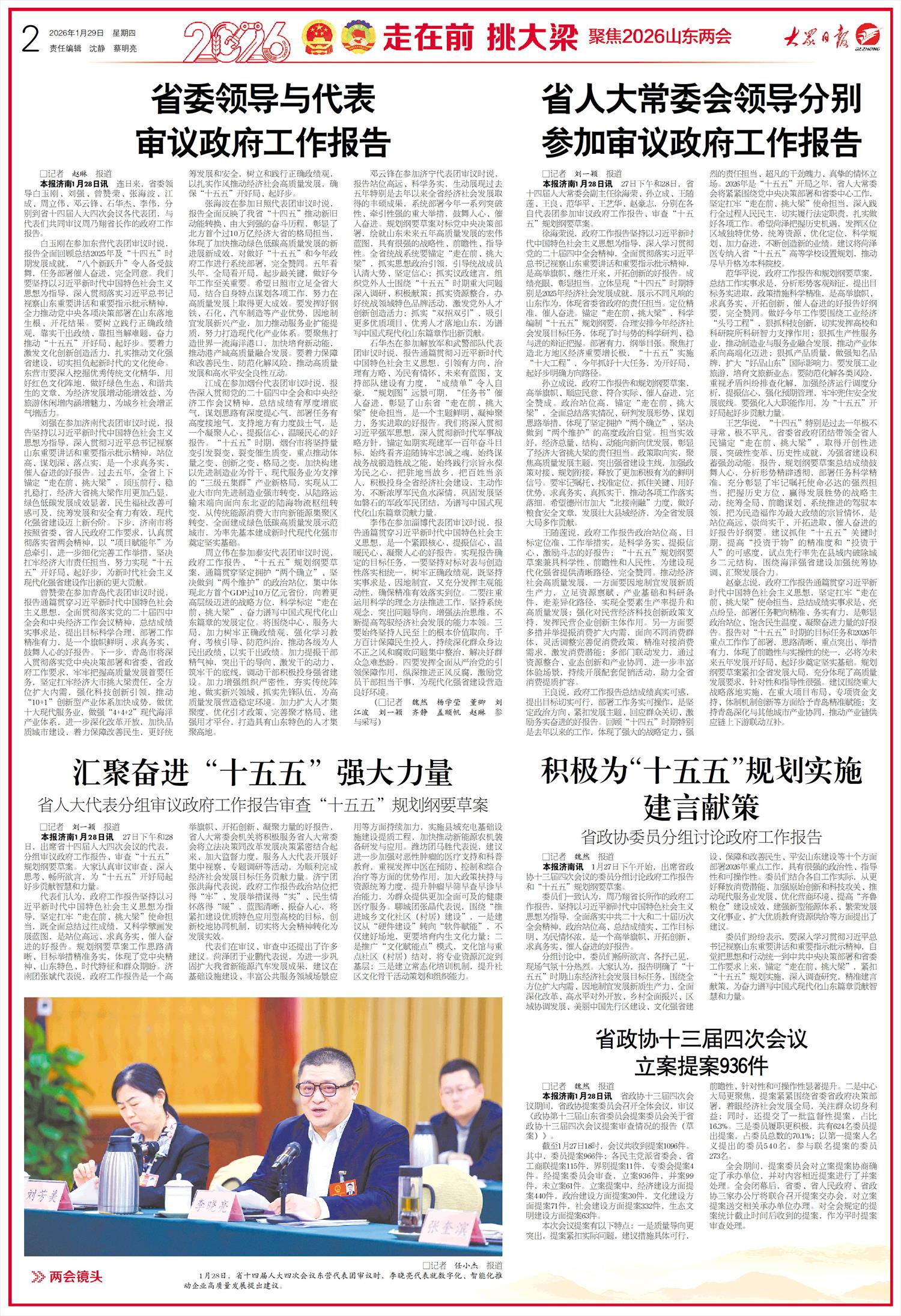 刘强在参加济南代表团审议时说,报告坚持以习近平新时代中国特色社会主义思想为指导,深入贯彻习近平总书记视察山东重要讲话和重要指示批示精神,站位高、谋划深、落点实,是一个求真务实、催人奋进的好报告。过去五年,全省上下锚定“走在前、挑大梁”,顶压前行、稳扎稳打,经济大省挑大梁作用更加凸显,绿色低碳发展成效显著,民生福祉改善可感可及,统筹发展和安全有力有效,现代化强省建设迈上新台阶。下步,济南市将按照省委、省人民政府工作要求,认真贯彻落实省两会精神,以“项目赋能年”为总牵引,进一步细化完善工作举措,坚决扛牢经济大市责任担当,努力实现“十五五”开好局、起好步,为新时代社会主义现代化强省建设作出新的更大贡献。