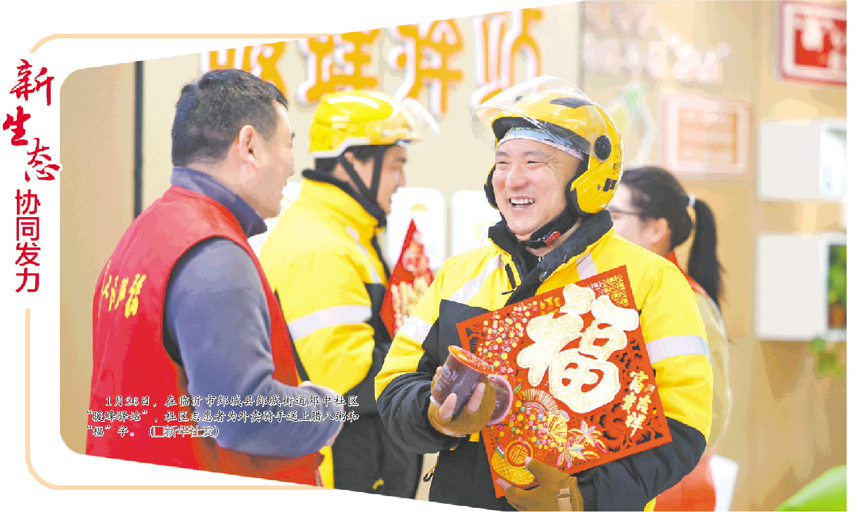 1月26日,在临沂市郯城县郯城街道郯中社区“暖蜂驿站”,社区志愿者为外卖骑手送上腊八粥和“福”字。(□新华社发)