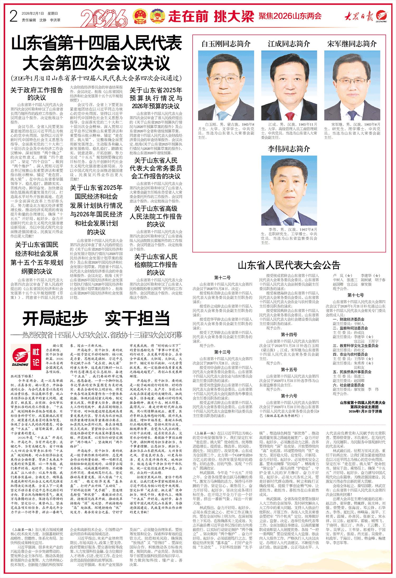 2026年是“十五五”开局之年。开局之年,当有开局之势;关键之年,当有关键之为。省十四届人大四次会议审查批准的“十五五”规划纲要,对山东经济社会发展作出全面部署,擘画了未来五年发展的宏伟蓝图。以一年为期,我们要开好局、起好步,为奋进“十五五”注入动力;以五年为期,我们要夯实基础、全面发力,确保基本建成新时代社会主义现代化强省取得决定性进展。全省上下一定要坚定不移沿着习近平总书记指引的方向,拿出跃马扬鞭的勇气、激发万马奔腾的活力、保持马不停蹄的干劲,坚定信心、乘势而上,坚决完成各项目标任务,在开局之年全力干出一个好年景、拼出一番新气象、闯出一片新天地。