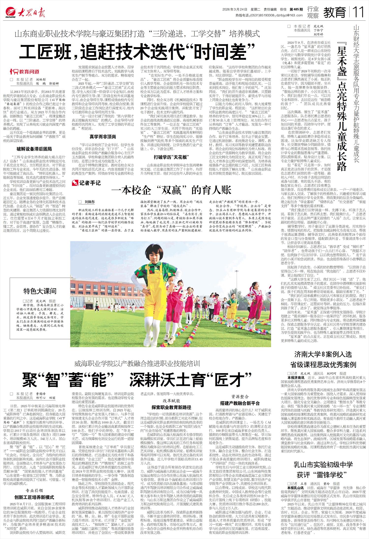 “山东商业职业技术学院与豪迈集团的合作,始于订单培养,但不止于就业安置。它通过机制创新,系统推进专业、课程、教材、教师、实习实训等教学关键要素联动改革,将企业的岗位标准转化为育人标准,将企业的生产资源转化为教学资源,将企业的工匠文化转化为校园文化,真正实现了校企在人才培养全过程中的深度协同,为培养高端装备产业急需的能工巧匠、大国工匠和高技能人才提供了解决方案。”山东商业职业技术学院党委副书记、院长张宗国说。