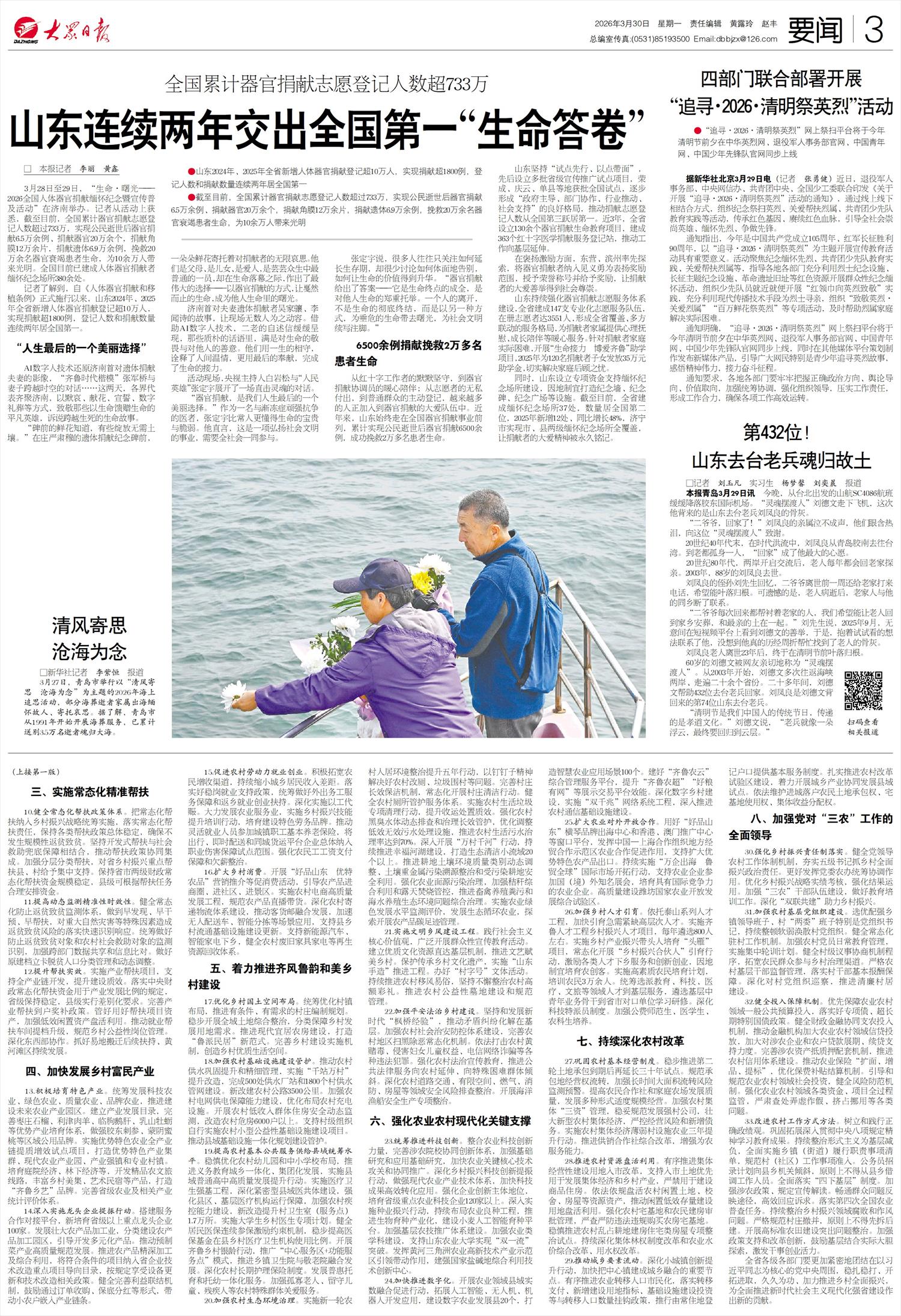 记者了解到,自《人体器官捐献和移植条例》正式施行以来,山东2024年、2025年全省新增人体器官捐献登记超10万人,实现捐献超1800例,登记人数和捐献数量连续两年居全国第一。