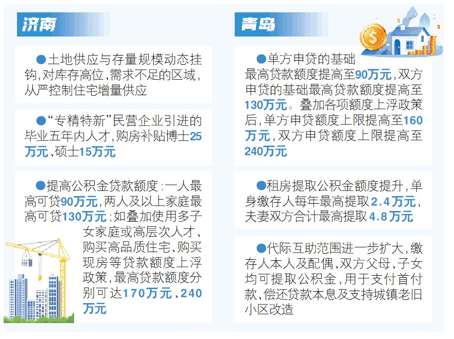 进一步优化公积金政策。提高公积金贷款额度:购买普通自住住房申请住房公积金贷款的,一人最高可贷90万元,两人及以上家庭最高可贷130万元;如叠加使用多子女家庭或高层次人才、购买高品质住宅、购买现房等贷款额度上浮政策,最高贷款额度分别可达170万元、240万元。