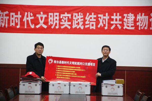 在座谈会上,双方就新时代文明实践载体建设、运行方式、服务内容及活动开展等情况,相互交流经验做法。桓台县精准对接曹县新时代文明实践工作需求,向曹县赠送了1000余套志愿者服装、100个志愿服务专用急救箱、500册桓台县新时代文明实践教材以及50套载有桓台县新时代文明实践活动内容的视频光盘等专用物资。