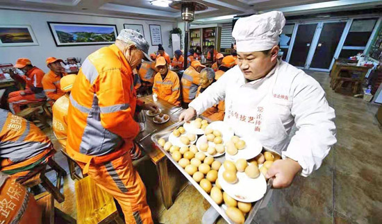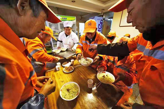 “小时候家里穷,吃过不少苦,也经常在寒风里赶大集摔面,起早赶集路上遇到最多的就是环卫工人,知道严冬里干活是什么滋味,这也是我能想到的最力所能及的回报。”姜常论说。