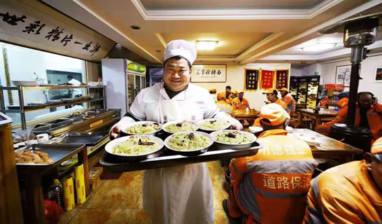 在那个寒冬,当多数人还沉睡在梦乡,郭城常论摔面馆已经亮起了灯。揉面、煮鸡蛋、熬骨汤、准备小菜……姜常论开始了一天的忙碌,为的就是让清晨劳作的环卫工人们吃上一顿热乎的早餐。两个店面每天每个店40-50个环卫工来就餐,除小凉菜外每人一个煮鸡蛋,大碗摔面一碗两碗管饱。每年这个最寒冷的季节里,一个多月的时间。姜常论哥俩都为这些默默无闻、辛勤劳作的环卫工人提供一份早餐。看到那一双双粗糙带着裂纹又黑乎乎的双手,捧着一碗碗热气腾腾的摔面,吃得津津有味,他们笑容洋溢在脸上,热面吃在肚里,暖意留在心里。五年时间,姜常论始终坚持,从最初的一个店到两个门店,从最初的30多人到近百人……五年时间他累计为环卫工提供了6000余人次的免费早餐,价值6万多元。