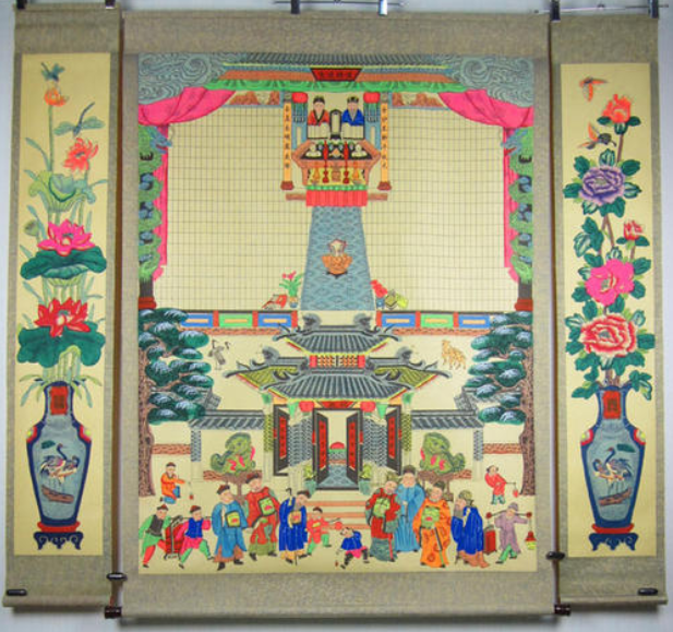 “迎家堂”之前,在正屋坐北朝南摆上家堂桌,桌子里里外外需擦得干干净净,再摆上祖宗的牌位或相框,有些地方还要挂出家堂画,上面绘制着家族世袭的繁衍脉络,如山东昌邑就有“姓姓有家谱,户户悬家堂”的说法,莫言在《故乡过年》中提到的也是“家堂轴子”。