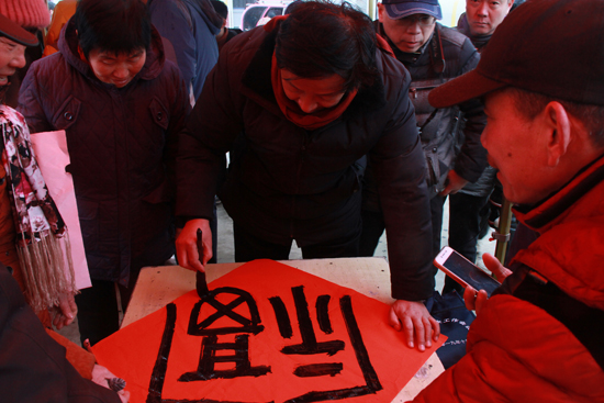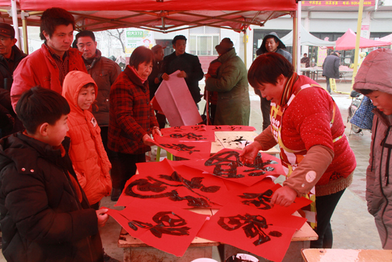台上演员激情演绎,台下书法家与剪纸艺术家们也没闲着。他们有的挥毫泼墨,现场为村民送祝福,有的则将提前备好的剪纸作品发放出去,赢得村民热捧。