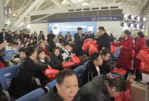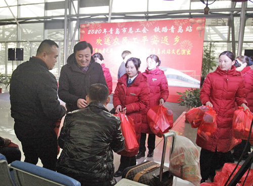 1月20日,青岛火车北站候车室洋溢着喜庆热烈的气氛,青岛市总工会、济南铁路局青岛站联合举行“欢送岛城建设者平安返乡”启动仪式。青岛市总工会、济南铁路局青岛站相关领导为乘坐当日K702次列车返乡的岛城建设者们送去了就业信息、食品、吉祥物、福贴等回家礼包,青岛市总工会“共同的家园”艺术团还为旅客们奉上了精彩的文艺演出。
