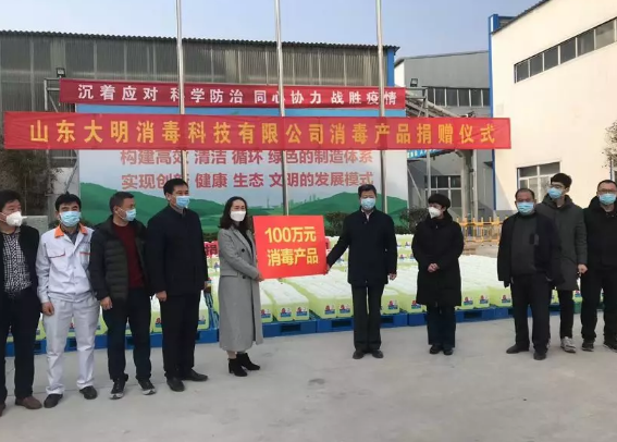 当天,山东大明消毒科技有限公司捐赠84消毒液等价值100万元消毒产品。“现在正值疫情防控的关键时刻,我们企业自大年初二起就组织工人加班加点,确保消毒物资正常供应。同时,我也特别希望能为家乡疫情防控尽一份绵薄之力,所以就安排出一些消毒产品通过市红十字会捐献给我们防控一线。”山东大明消毒科技有限公司董事长邵长银表示,下一步,公司将继续加紧生产,持续关注防疫工作开展的需要,尽己所能,筹集更多的人力物力财力,为早日战胜疫情贡献力量。据了解,此前,该公司已经向企业所属的界河镇捐献了价值20万元的消毒产品。此次面向全市捐赠的100万元消毒产品将统一调配到各防控点。