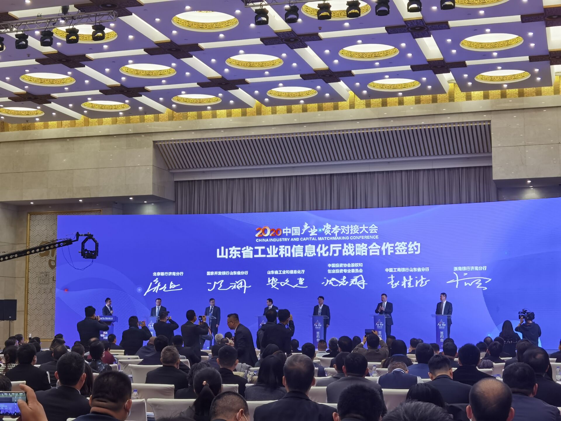 会上,省工信厅与中国投资协会股权和创业投资专业委员会、工商银行山东省分行、国家开发银行山东省分行、北京银行济南分行、浙商银行济南分行,北京银行与东兴证券股份有限公司、申银万国投资有限公司、方正证券股份有限公司、济南基金业协会、山东省瞪羚企业发展促进会,共青团山东省委与中关村股权投资协会、五道口投资、36氪氪基金、点亮伯恩创投、海邦人才基金,山东领锐股权投资基金与朗峰新材料科技股份有限公司、深圳泰明嘉业药业有限公司、氢阳新能源控股有限公司、山东精创磁电产业技术研究院有限公司、山东省科学院新材料研究所分别签署战略合作协议。另有一批产投合作项目进行洽谈对接。