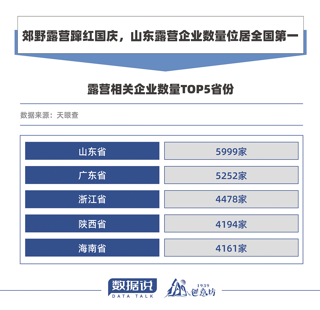 数据显示,目前山东露营地数量位居全国第一,已近4000家。天眼查数据显示,国内现有6.6万家露营相关企业,其中山东省数量最多,有近6000家。
