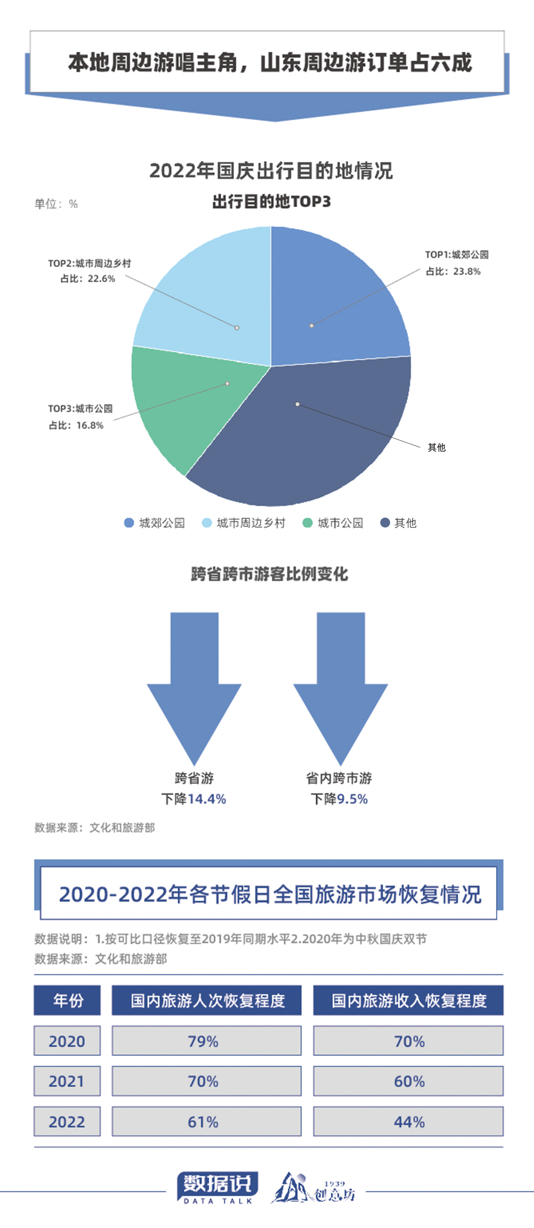 携程《2022年国庆假期旅游总结报告》显示,国庆7天,本地、周边旅游订单占比达65%。山东本地周边旅游订单占比达60%,本地周边人均旅游花费较去年国庆增长近11%。