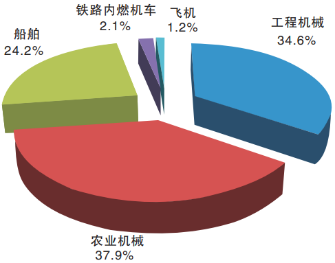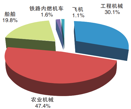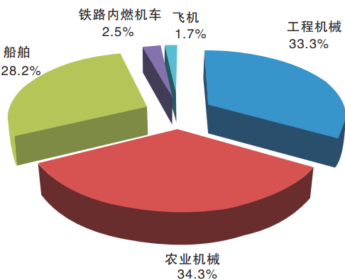 其中,工程机械、农业机械、船舶、铁路内燃机车、飞机排放的碳氢化合物(HC)分别占非道路移动源排放总量的30.1%、47.4%、19.8%、1.6%、1.1%;排放的氮氧化物(NOx)分别占非道路移动源排放总量的33.3%、34.3%、28.2%、2.5%、1.7%;排放的颗粒物(PM)分别占非道路移动源排放总量的34.6%、37.9%、24.2%、2.1%、1.2%。
