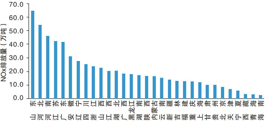 2019 年全国机动车污染物排放量中,氮氧化物(NOx)排放量前五位的省份依次为山东、河北、河南、江苏、广东。全国各省份机动车氮氧化物(NOx)排放量如下: