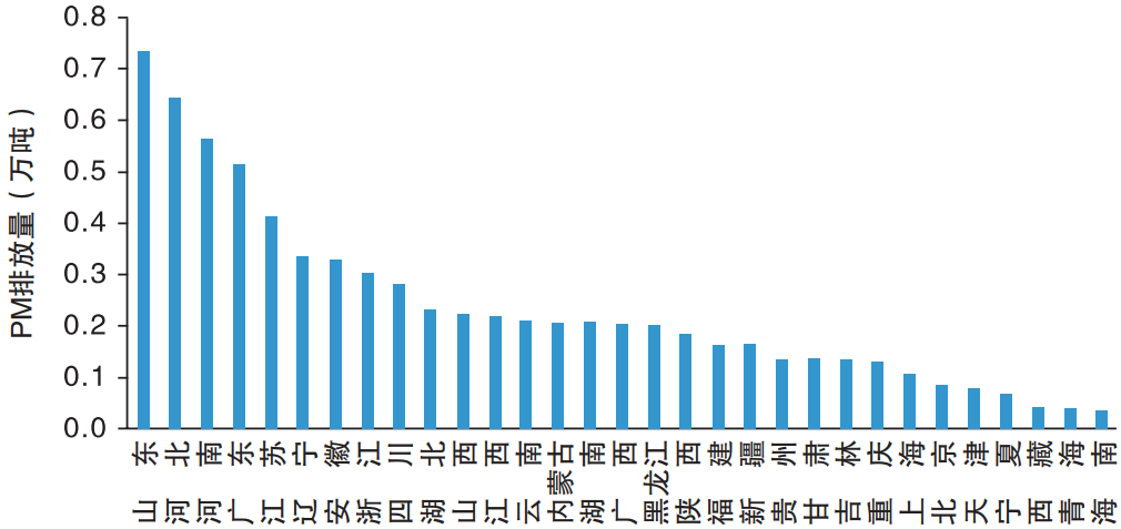 2019 年全国机动车污染物排放量中,颗粒物(PM)排放量前五位的省份依次为山东、河北、河南、广东、江苏。全国各省份机动车颗粒物(PM)排放量如下: