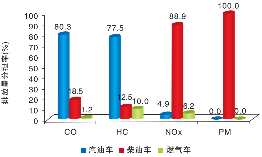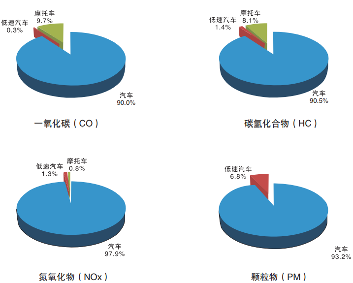 2019年,全国机动车四项污染物排放总量初步核算为1603.8万吨。其中,一氧化碳(CO)、碳氢化合物(HC)、氮氧化物(NOx)、颗粒物(PM)排放量分别为771.6万吨、189.2万吨、635.6万吨、7.4万吨。汽车是污染物排放总量的主要贡献者,其排放的CO、HC、NOx和PM等四项主要污染物均超过90%。柴油车NOx排放量超过汽车排放总量的80%,PM排放量超过90%;汽油车CO排放量超过汽车排放总量的80%,HC排放量超过70%。