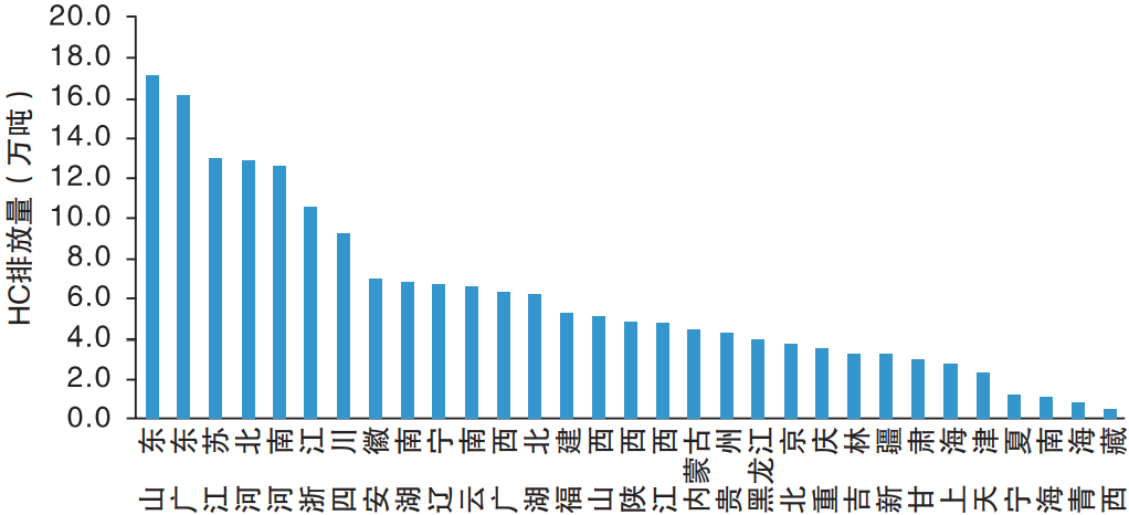 2019 年全国机动车污染物排放量中,碳氢化合物(HC)排放量前五位的省份依次为山东、广东、江苏、河北、河南。全国各省份机动车碳氢化合物(HC)排放量如下:
