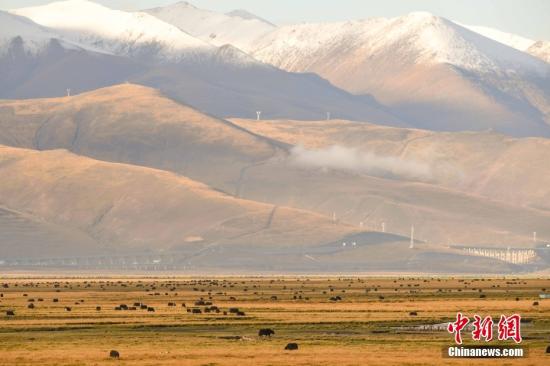 西藏各地进入深秋时节,茫茫草原变成金黄一片,牧民们加紧收割储草,准备度冬,草原、蓝天、白云、雪山,“雪域高原”进入一年中色彩最丰富的时期,美如画卷。 中新社记者 贡嘎来松 摄