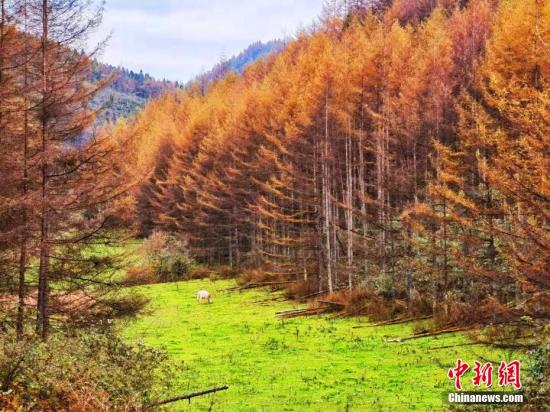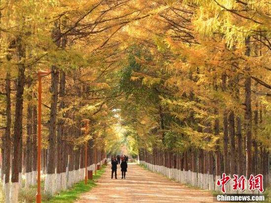 10月19日,吉林长春,市民在百木园“黄金大道”景观路上行走。入秋以来,长春市百木园一条近500米道路两侧落叶松变成了金黄色,吸引游客打卡拍照。 中新社发 刘栋 摄