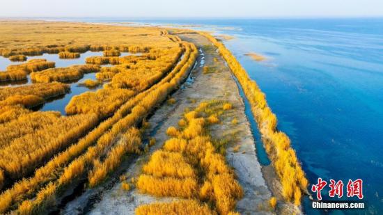 10月24日,无人机航拍新疆巴音郭楞蒙古自治州博湖县博斯腾湖湿地秋景。金秋时节,位于新疆维吾尔自治区巴音郭楞蒙古自治州博湖县境内的博斯腾湖碧波荡漾。 中新社发 年磊 摄 图片来源:cnsphoto