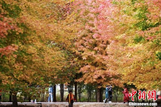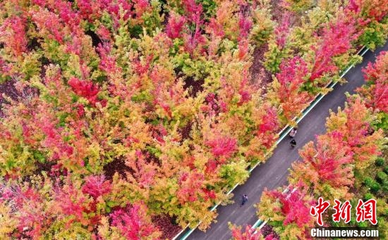 10月28日,在山东省青岛西海岸新区张家楼镇珠山芝田生态园,游人正在欣赏美丽"枫"景。该生态园内种植了美国红枫、秋红枫多达6000余株,如今已到了最佳观赏期。 中新社发 王培珂 摄 图片来源:CNSPHOTO
