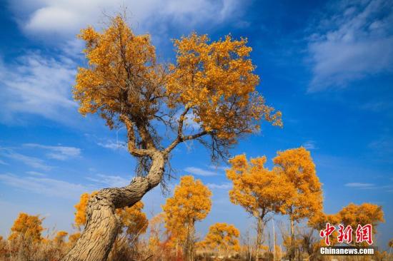 金秋十月,新疆博湖县境内的胡杨林进入最佳观赏季,胡杨树叶陆续泛黄,与蓝天、白云、沙漠勾勒出一幅色彩动人的生态画卷,吸引游客前来观光旅游。年磊 摄
