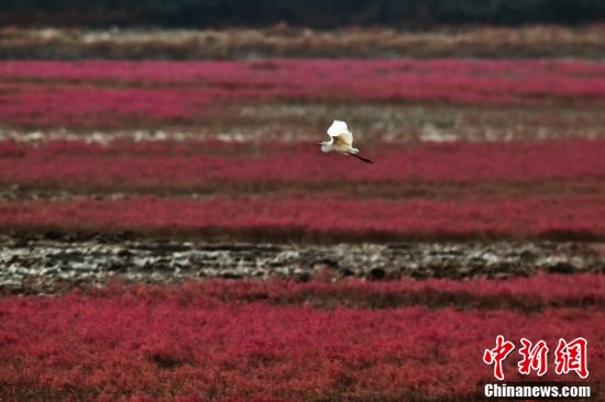 10月24日,一只白鹭在山东省青岛市胶州湿地的红海滩上飞过。 中新社发 王海滨 摄 图片来源:CNSPHOTO