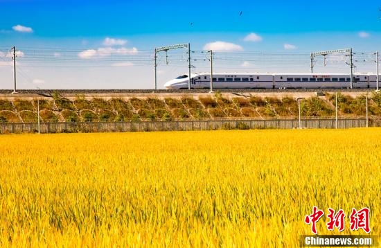 10月17日,江苏省连云港市东海县的金色稻田里,美丽的乡村、四通八通的路网,还有穿行其中的高速动车,共同交织在一起,构成一幅幅秋意盎然、充满生机的希望画卷。中新社发 李娇 摄 图片来源:CNSPHOTO