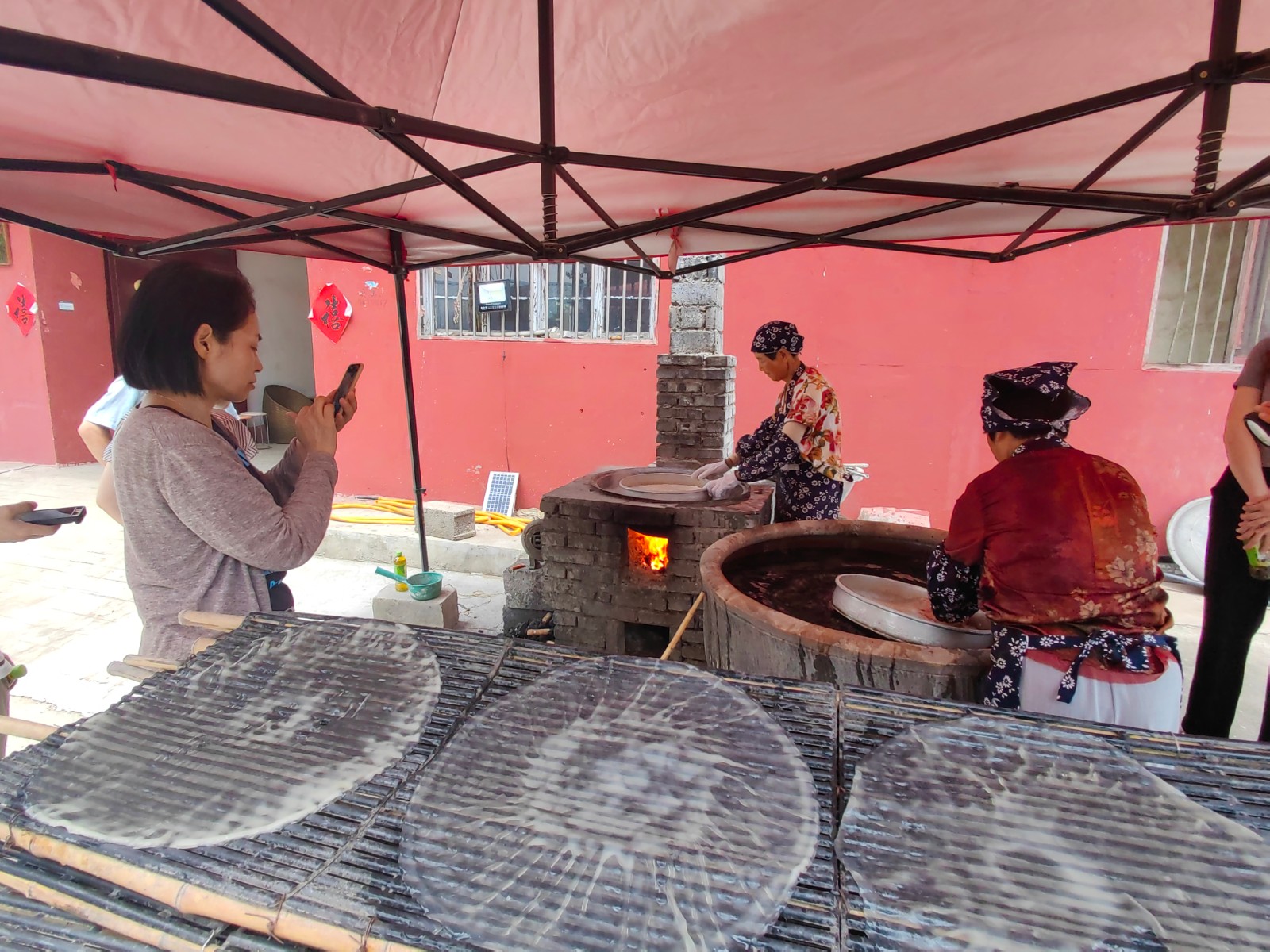 随着手里的勺子一起一落,倒进镟子里的淀粉糊便均匀散开。经过起皮、拔水、贴帘晾晒三道工序,一张粉皮就制成了。