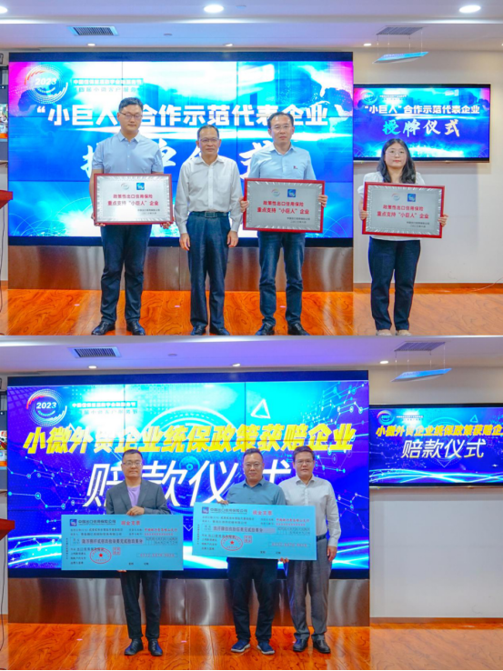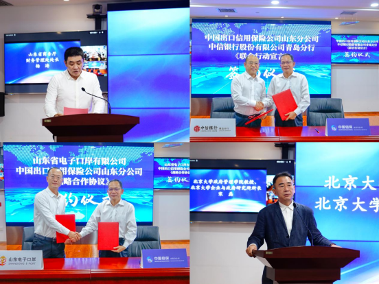 开幕式上,中国信保山东分公司与山东省工信厅签署了《推动山东省中小企业高质量发展合作备忘录》,与中信银行青岛分行签署了《数字服务支持中小微外贸企业联合行动宣言》,与山东省电子口岸有限公司签署了《战略合作协议》。中国信保山东分公司现场为小微企业代表现场颁授赔款,并为“小巨人”企业授牌,充分展现中国信保将信用保险优质服务惠及小微外贸企业的新服务理念。北京大学政府管理学院宋磊教授就《政策性出口信用保险支持山东普惠金融履职研究》作课题解读,并共同启动研究课题。