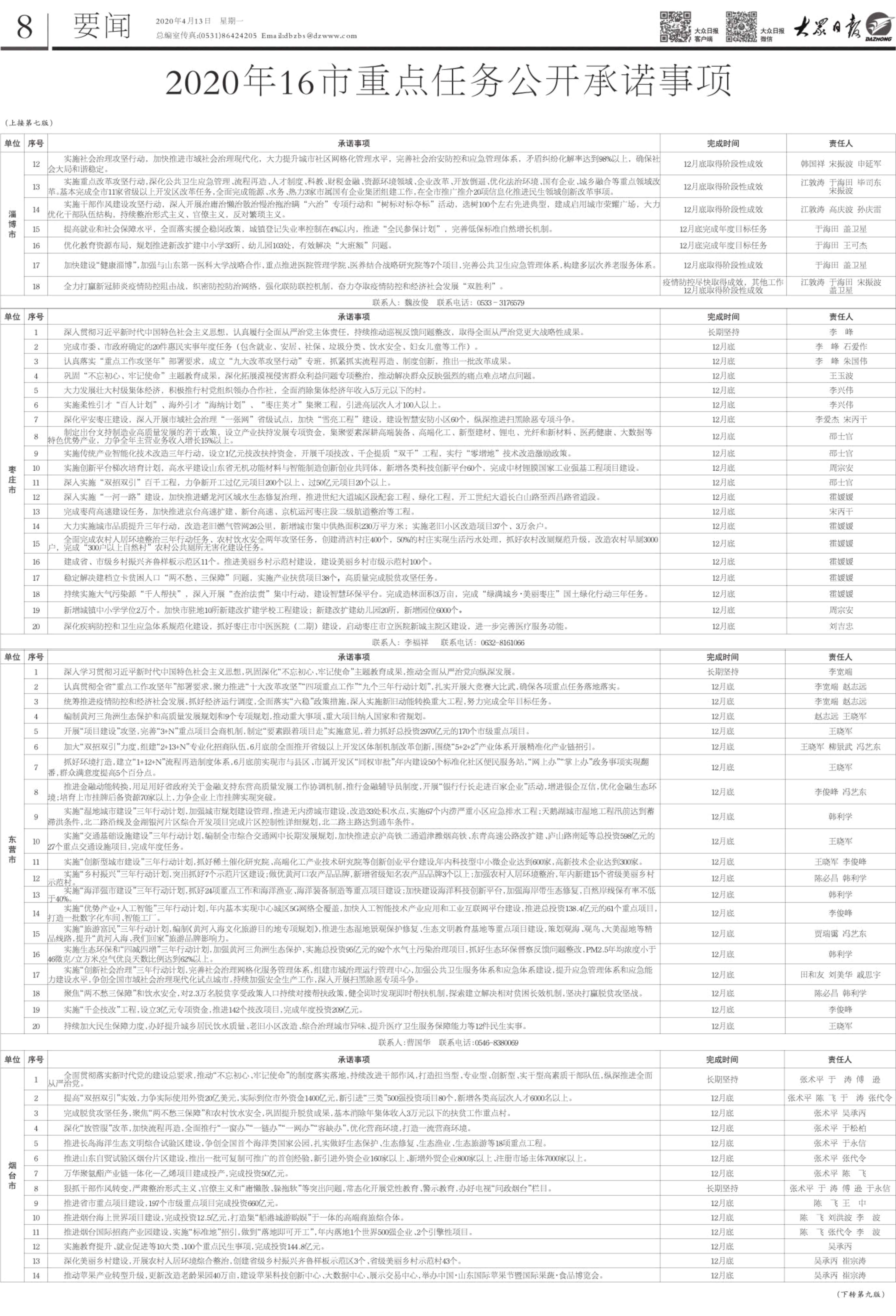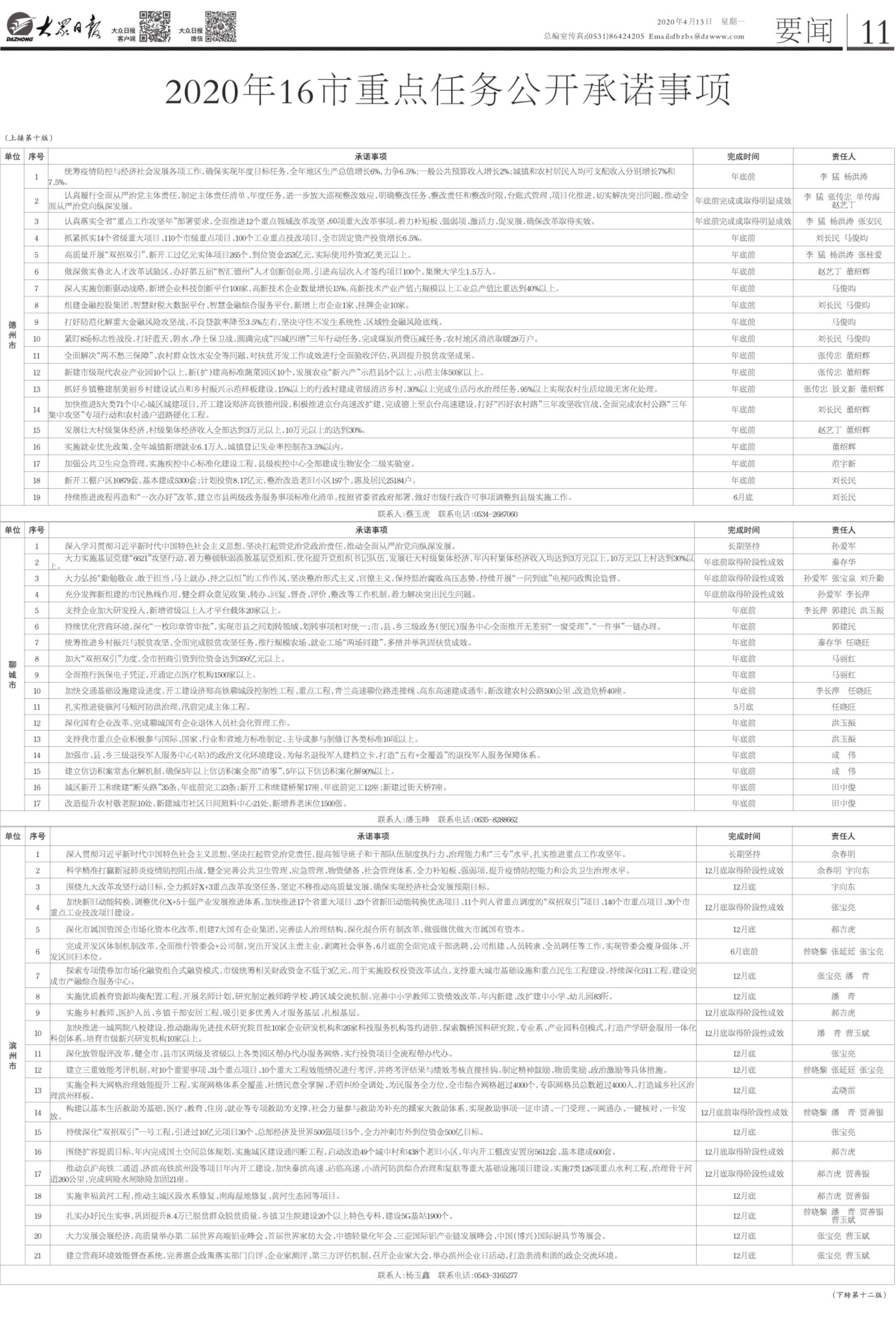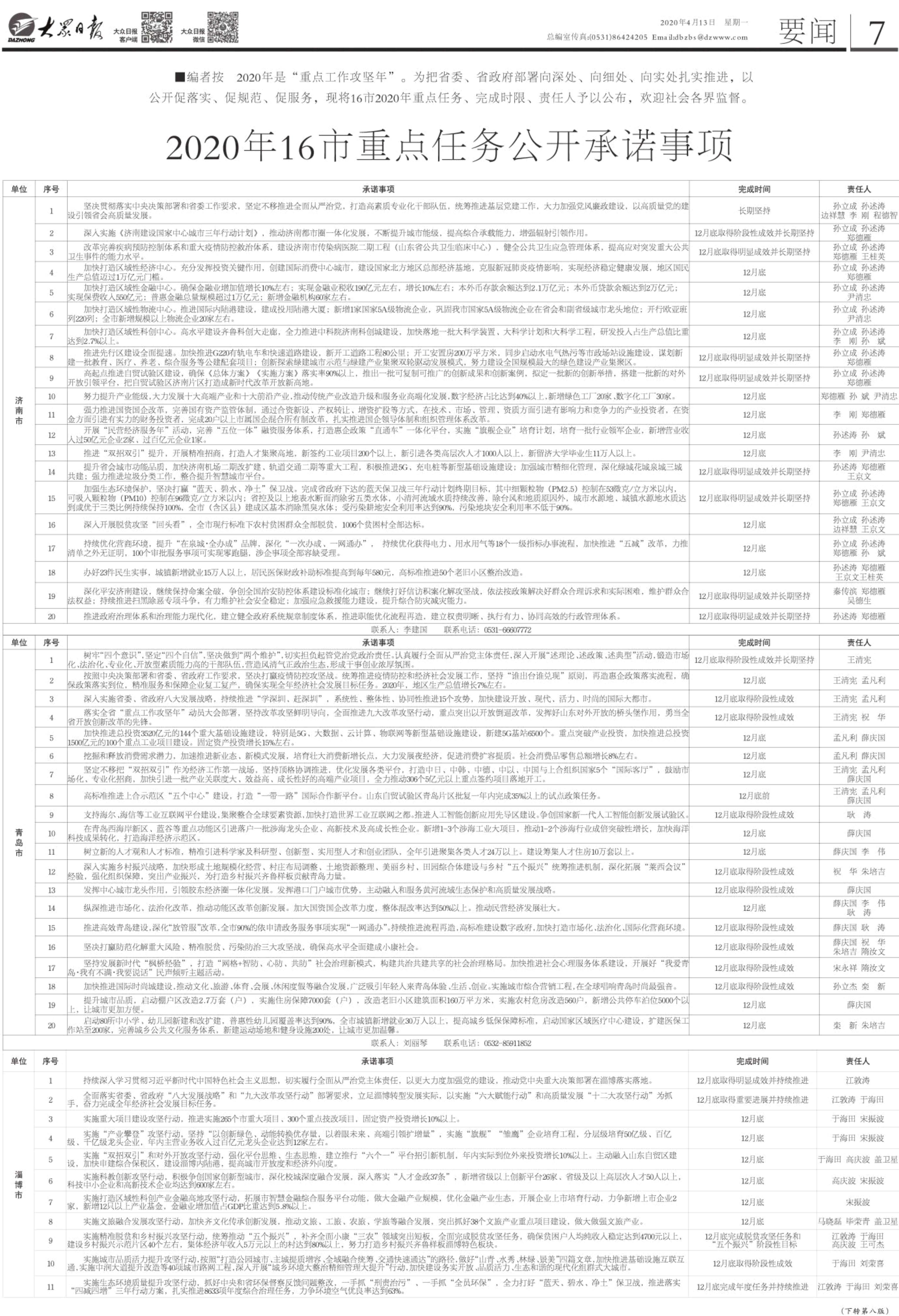 2020年是“重点工作攻坚年”。为把省委、省政府部署向深处、向细处、向实处扎实推进,以公开促落实、促规范、促服务,今天见报的《大众日报》用6个版的篇幅将16市2020年重点任务、完成时限、责任人予以公布,并欢迎社会各界监督。记者留意到,不少任务当地市委书记、市长便是主要责任人,来看看有您关注的事项吗>>>